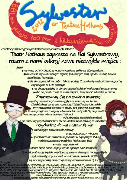 przychodzšc do Teatru Hothaus zapomnij o konwencjonalnym Sylwestrze. Tu wszystko może się zdarzyć. Na pewno musisz chcieć się spotkać i przeżyć tę noc ze wszystkimi, którzy pojawiš się w ostatniš noc roku 2012