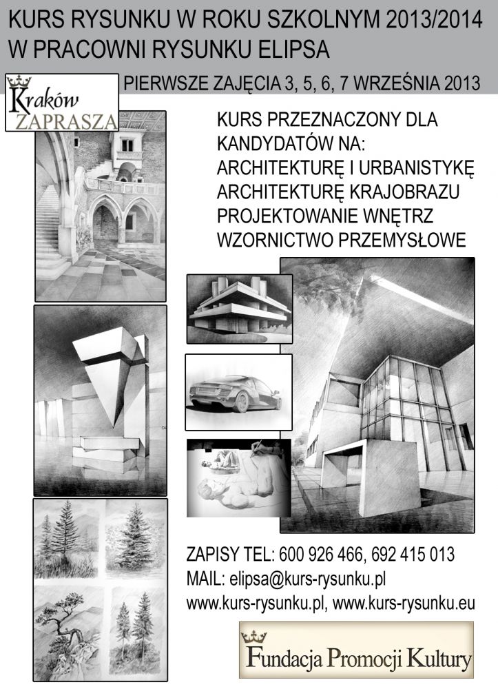 Kurs Rysunku Odręcznego dla Kandydatów na studia: Architektura i Urbanistyka, Architektura Krajobrazu, Projektowanie Wnętrz, Wzornictwo Przemysłowe w roku szkolnym 2013/2014 Jak co roku, zapraszamy na kurs rysunku odręcznego organizowany przez pracownie rysunku Elipsa w Krakowie. Zajęcia prowadzone przez Architektów IARP, członków Stowarzyszenia Architektów Polskich, doktorantów Wydziału Architektury Politechniki Krakowskiej.