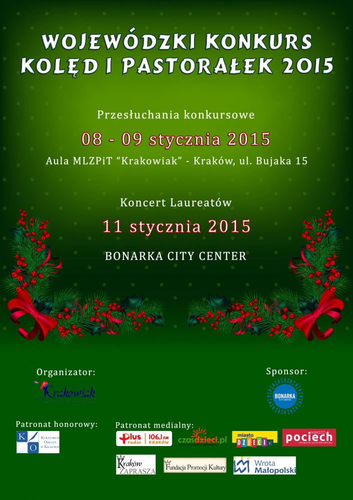 Po raz piętnasty MLZPiT „Krakowiak” organizuje Wojewódzki Konkurs Kolęd i Pastorałek. Jest to wydarzenie, które od wielu lat cieszy się niesłabnącą popularnością. W okresie bożonarodzeniowym do Krakowa zjeżdżają zespoły, soliści, chóry i grupy kolędnicze z całej Małopolski i okolic. Podczas Konkursu na scenie można usłyszeć oryginalne wykonania kolęd a także pastorałek. Koncert laureatów odbędzie się dnia 11 stycznia 2015r. w Bonarka City Center.
