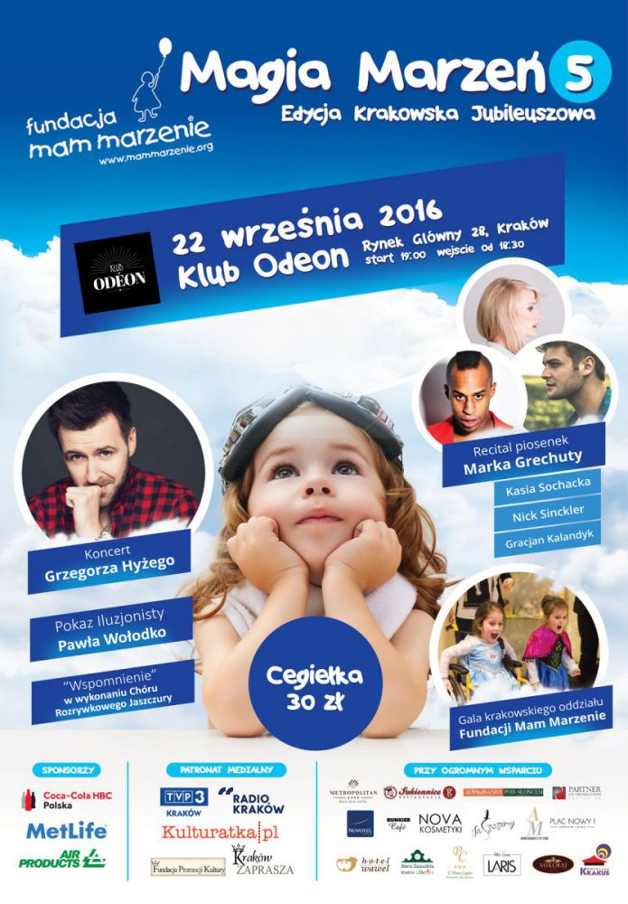 Już po raz piąty - Ambasador Fundacji Mam Marzenie Małgorzata Kożuchowska oraz wolontariusze serdecznie zapraszają wszystkich na koncert charytatywny "Magia Marzeń V – edycja krakowska jubileuszowa", który odbędzie się 22 września 2016 roku o godzinie 19 w klubie Odeon przy ul. Rynek Główny 28 w Krakowie.