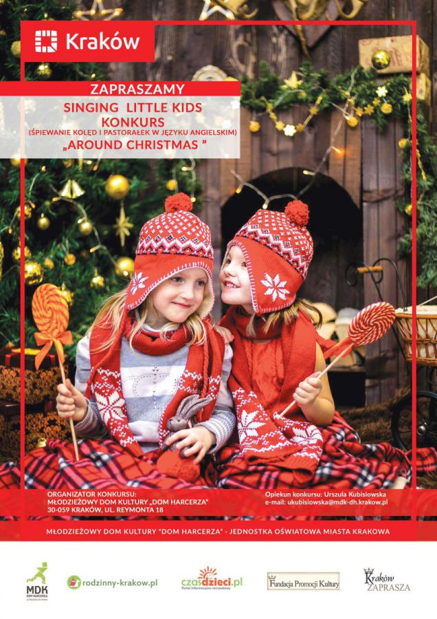Młodzieżowy Dom Kultury „Dom Harcerza” zaprasza do udziału w konkursie AROUND CHRISTMAS, czyli śpiewanie kolęd i pastorałek w języku angielskim. Konkurs skierowany jest do dzieci w wieku od 3 do 6 lat. Celem konkursu jest zachęcenie małych dzieci do nauki języka angielskiego, zainteresowanie ich kulturą anglosaską oraz rozśpiewanie najmłodszych.