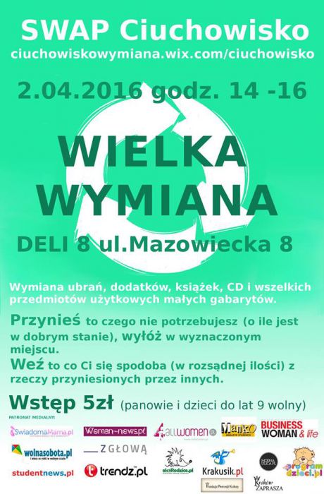 Kolejna edycja szalonej wymiany ubrań i dodatków czyli Krakowskiego Ciuchowiska. Widzimy się w Deli8 ul.Mazowiecka 8. Wymiana odbywać się będzie na stołach.