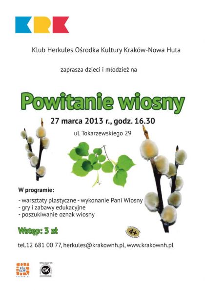 Klub Karino Ośrodka Kultury Kraków-Nowa Huta (ul. Truskawkowa 4) zaprasza 22 marca br. o godz. 16.00 na imprezę przygotowaną przez przedszkolaki uczęszczające na zajęcia plastyczne do Klubu i dzieci z kółka teatralnego.