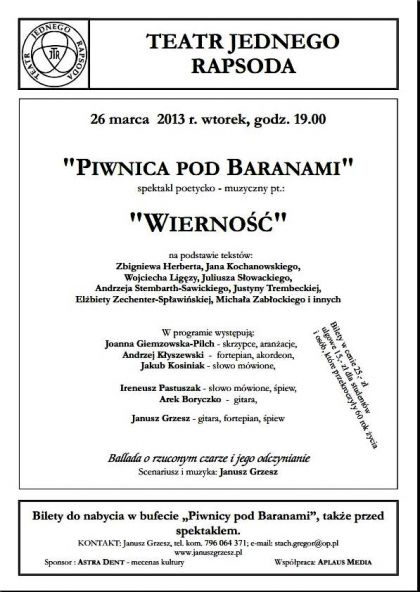 "PIWNICA POD BARANAMI" spektakl poetycko - muzyczny pt.: "WIERNOŚĆ"