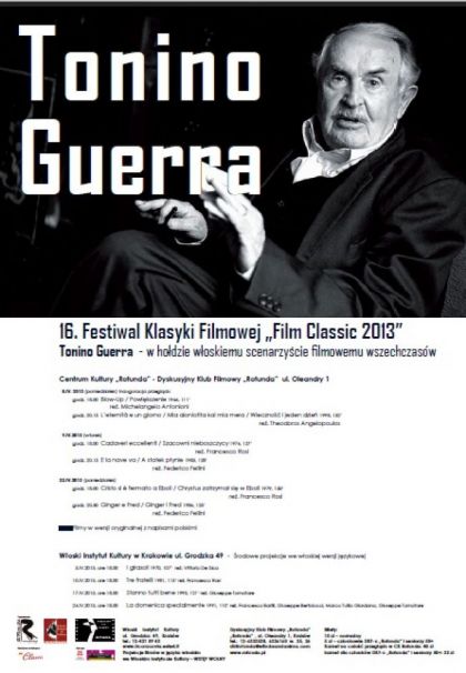 W kwietniu Dyskusyjny Klub Filmowy "Rotunda" oraz Włoski Instytut Kultury w Krakowie zaprasza na filmy ze scenariuszem Tonino Guerra. Zobaczymy m.in. filmy nagrodzone w Cannes - "Powiększenie", "Wieczność i jeden dzień", a także głośne filmy Felliniego "A statek płynie" czy "Ginger i Fred". Zobaczymy także filmy Francesco Rosi, Tornatore i innych.