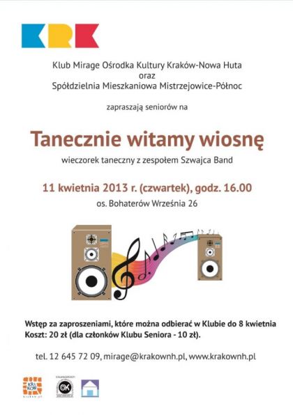 Klub Mirage Ośrodka Kultury Kraków-Nowa Huta (os. Bohaterów Września 26) zaprasza na wieczorek taneczny dla seniorów.