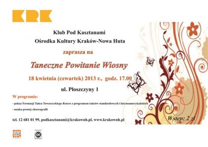 W osiedlu Kościelniki tradycją już stało się witanie wiosny w tanecznych rytmach. W programie imprezy organizowanej przez Klub Pod Kasztanami Ośrodka Kultury Kraków-Nowa Huta (ul. Płoszczyny 1) znajdzie się zatem pokaz tańców standardowych i latynoamerykańskich w wykonaniu Formacji Tańca Towarzyskiego Return. Uczestnicy imprezy będą mieli też okazję nauczyć się prostej choreografii.