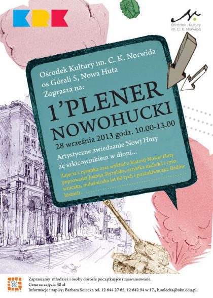 Zapraszamy młodzież i osoby dorosłe (początkujące i zaawansowane) na artystyczne zwiedzanie Nowej Huty ze szkicownikiem w dłoni. Zajęcia rysunku, oraz wykład o historii Nowej Huty poprowadzi Joanna Styrylska - artystka, malarka i rysowniczka, miłośniczka lat 60-tych i poszukiwaczka śladów historii.