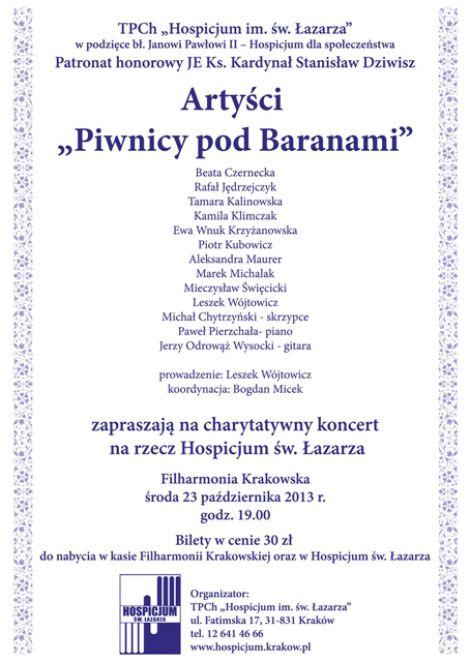 W dniu 23 października br. o godzinie 19.00 w sali Filharmonii Krakowskiej Artyści „Piwnicy pod Baranami” wystąpią w charytatywnym koncercie na rzecz Hospicjum św. Łazarza. W ten wyjątkowy wieczór będzie można nie tylko posłuchać poezji w mistrzowskim wykonaniu, ale również wesprzeć finansowo Hospicjum i wyrazić swoją solidarność z chorymi potrzebującymi naszej wspólnej troski.