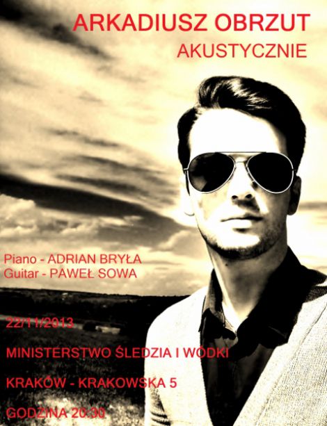 Arkadiusz Obrzut - aktor scen muzycznych, przy wspaniałych aranżacjach muzyki popularnej z najwyższej półki, jak i utworach własnych zaśpiewa na Akustycznym Koncercie w Ministerstwie Śledzia i Wódki. Nastrój tego oryginalnego, niezwykle klimatycznego miejsca idealnie współgra z energią proponowanych kompozycji. Dobrze przygotowana muzyka, z wokalem Arkadiusza czeka na oddaną publiczność i dobrą zabawę!