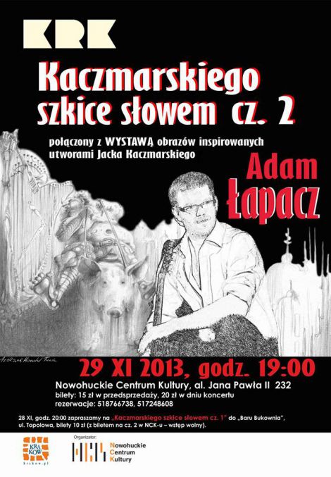 Próba przeniesienia na płótno myśli zawartych w tekstach Mistrza, odczuć własnych związanych z muzyką, jest zadaniem niełatwym. Jak to się udało młodym malarzom będziecie się Państwo mogli przekonać w trakcie koncertu, któremu towarzyszyła będzie wystawa wspomnianych prac. Połączenie malarskich poszukiwań artystów malarzy z tekstami Jacka Kaczmarskiego w świetnym wykonaniu Adama Łapacza daje gwarancję udanego kulturalnego wieczoru w Nowohuckim Centrum Kultury. Zapraszamy serdecznie.