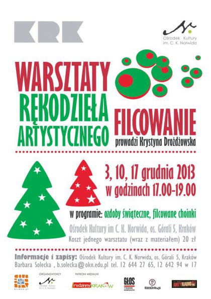 Zapraszamy na warsztaty rękodzieła artystycznego, na grudniowych spotkaniach będziemy tworzyć ozdoby świąteczne (kule śniegowe, bombki w sweterku na sucho) i filcowane choinki.