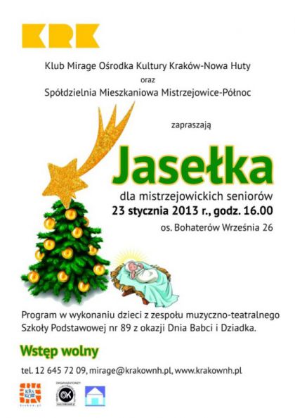 Klub Mirage Ośrodka Kultury Kraków-Nowa Huta (os. Bohaterów Września 26) zaprasza 23 stycznia o godz. 16.00 na Jasełka w wykonaniu dzieci z zespołu muzyczno-teatralnego Szkoły Podstawowej nr 89, a następnie wspólna biesiada.