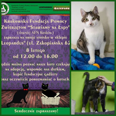 Przed nami bardzo intensywny weekend - na dobry początek zapraszamy na spotkanie z naszymi kotami do sklepu Leopardus - Sieć Sklepów Zoologicznych na Zakopiance w najbliższą sobotę 8 luty od 12 do 16 Matrix i Klara będą kwestować z naszymi wolontariuszami.