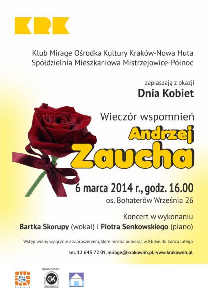 Klub Mirage Ośrodka Kultury Kraków-Nowa Huta (os. Bohaterów Września 26) zaprasza na koncert z okazji Dnia Kobiet w wykonaniu Bartka Skorupy (wokal) i Piotra Senkowskiego (piano). W programie wieczoru usłyszymy najbardziej znane utwory Andrzeja Zauchy, m.in. Bądź moim natchnieniem, Cest La Vie , Jak na lotni.