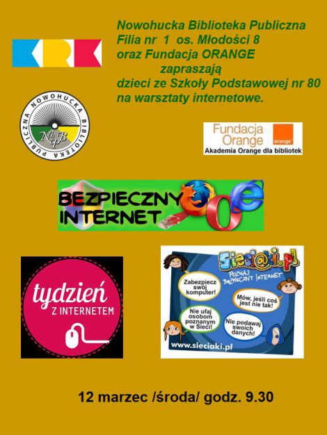 Filia nr 1 Nowohuckiej Biblioteki Publicznej i Fundacja ORANGE zapraszają dzieci na Warsztaty internetowe pn. „Wiosna i Internet” w cyklu: „Legalnie w necie”. Zajęcia poprowadzi wolontariusz Fundacji ORANGE Pan Arkadiusz Wesołowski.