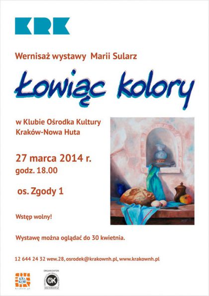 Klub Ośrodka Kultury Kraków-Nowa Huta (os. Zgody 1) zaprasza 27 marca o godz. 17.00 na wernisaż Marii Sularz, artystki od urodzenia związanej z Krakowem, dla której to miasto jest głównym tematem i źródłem inspiracji.