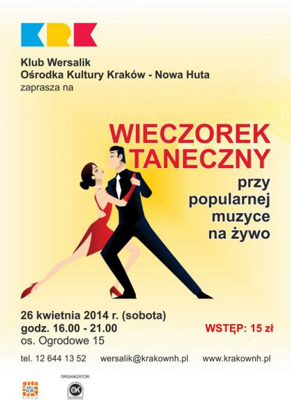Po świątecznej przerwie wracają taneczne zabawy dla dorosłych w Klubie Wersalik Ośrodka Kultury Kraków-Nowa Huta (os. Ogrodowe 15). Zapraszamy już 26 kwietnia, w godz. 16.00-21.00. Do tańca przygrywać będzie zespół Mariana Soi. Propozycja dla osób, które sobotni wieczór chcą spędzić bawiąc się na parkiecie. Ilość miejsc ograniczona. Informacje i zapisy w Klubie (tel. 12 644 13 52, wersalik@krakownh.pl).