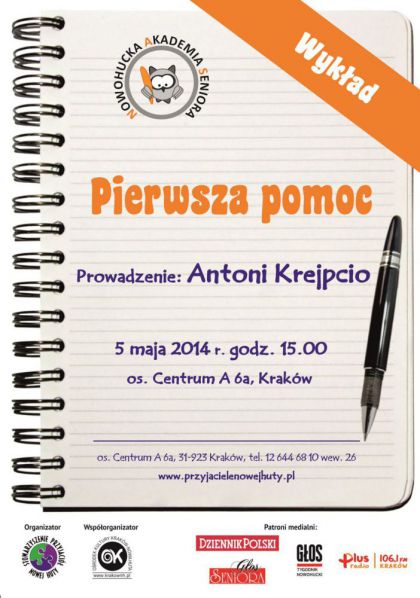 Pierwszy majowy wykład w Nowohuckiej Akademii Seniora poświęcony będzie zagadnieniom z zakresu podstaw prawnych udzielania pierwszej pomocy i zasadom wzywania służb ratowniczych. Spotkanie poprowadzi ratownik medyczny Antonii Krejpcio, który omówi także niektóre ze stanów zagrożenia życia m.in. zatrzymanie krążenia, udar mózgu, padaczkę.