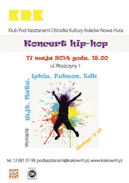 Do Kościelnik zawitają raperzy reprezentujący krakowską i oświęcimską scenę hip-hop. W swoich tekstach poruszają tematy problematyczne, jednak nie propagujące przemocy. Koncert w Klubie Pod Kasztanami Ośrodka Kultury Kraków-Nowa Huta adresowany jest przede wszystkim do młodzieży, lecz zapraszamy wszystkich zainteresowanych.