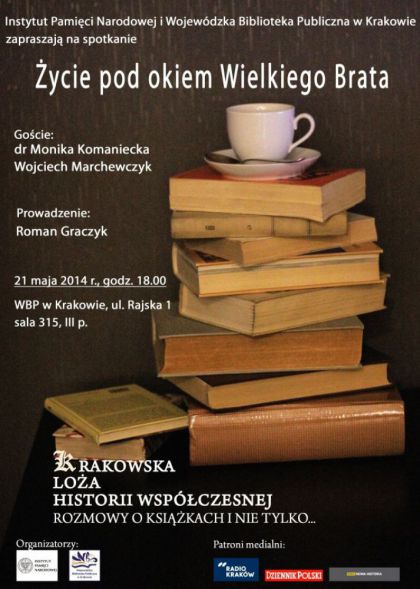 Instytut Pamięci Narodowej oraz Wojewódzka Biblioteka Publiczna w Krakowie zapraszają na spotkanie „Życie pod okiem Wielkiego Brata”. W dyskusji wezmą dr Monika Komaniecka oraz Wojciech Marchewczyk. Spotkanie poprowadzi Roman Graczyk.