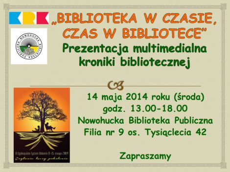 Filia nr 9 Nowohuckiej Biblioteki Publicznej włączyła się w organizację XI Ogólnopolskiego Tygodnia Bibliotek. Imprezy realizowane w Tygodniu Bibliotek będą popularyzowały czytelnictwo i bibliotekę. Podczas pokazu multimedialnego prezentowane będą najważniejsze dokonania Biblioteki w latach 2008-2014, zostaną pokazane zdjęcia m. in. z: imprez edukacyjnych, wystaw i spotkań autorskich.