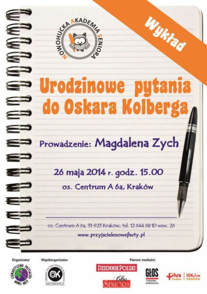 Stowarzyszenie Przyjaciół Nowej Huty oraz Ośrodek Kultury Kraków-Nowa Huta zapraszają 26 maja o godz. 15.00 na ostatni w tym roku wykład w Nowohuckiej Akademii Seniora poświęcony postaci Oskara Kolberga.
