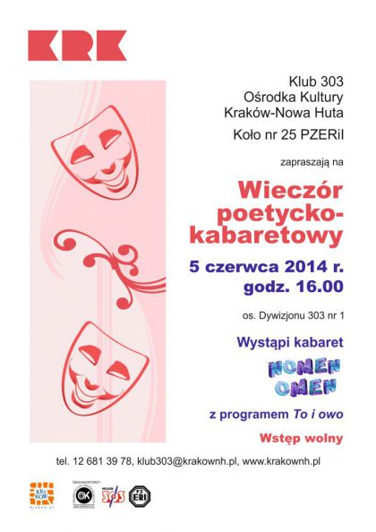 Klub 303 Ośrodka Kultury Kraków-Nowa Huta (os. Dywizjonu 303 nr 1) zaprasza 5 czerwca o godz. 16.00 na występ kabaretu Nomen Omen z programem To i owo. Będzie można obejrzeć również pokaz mody zespołu Zawilec oraz wysłuchać wierszy i monologów satyrycznych w wykonaniu seniorów. Nomen Omen to niedawno powstały zespół, składający się z czworga studentów krakowskich uczelni, których połączyła pasja oraz chęć wspólnej działalności kabaretowej.