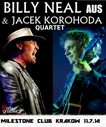 Charyzmatyczny wokalista, saksofonista, gitarzysta i kompozytor z Australii – Billy Neal występuje na scenie od piątego roku życia. Jako dziecko grał w Royal English Opera i Covent Garden Opera. Na swoim koncie ma również filmowe „przygody”, jak choćby epizod w filmie z Sophią Loren i Richardem Burtonem. Z zamiłowania jest żeglarzem, a do najbardziej ekscentrycznych jego wyczynów należy przepłynięcie Kanału Angielskiego w wannie, dzięki czemu został w 1981 roku wpisany do Księgi Rekordów Guinessa. Gdy zdecydował w pełni poświęcić się muzyce, stworzył grupę The Right Honorable Gentlemen i wyruszył w trasę koncertową po Niemczech. Kolejny zespół Billy’ego to The Rhythm Machine, który był zapraszany na występy m.in. przez Roberta Planta i Micka Jaggera a nawet przez angielskie księżniczki: Dianę i Annę. Miał okazję nagrywać m.in. w słynnym studio Abbey Road. W roku 1997 Bill po raz pierwszy przyjechał do Polski, w której zakochał się do tego stopnia, iż rok później poślubił Polkę -Ewę i wybudował w Polsce dom. Wrócił jednak do Australii, lecz regularnie przylatuje do Europy, gdyż w Wielkiej Brytanii jest liderem zespołu General Confusion, z którym wystąpił m.in. w londyńskim Savoy. W Polsce jak dotąd ukazały się trzy płyty: ”I Love The Blues” (2011), ”Live! At Impart” (2012) oraz najnowsza ”I Believe” (2013), którą wypełniły jego autorskie kompozycje. Niejednokrotnie porównywany do Joe Cockera, Billy Neal występuje w tym roku wraz z krakowskim gitarzystą i kompozytorem Jackiem Korohodą.