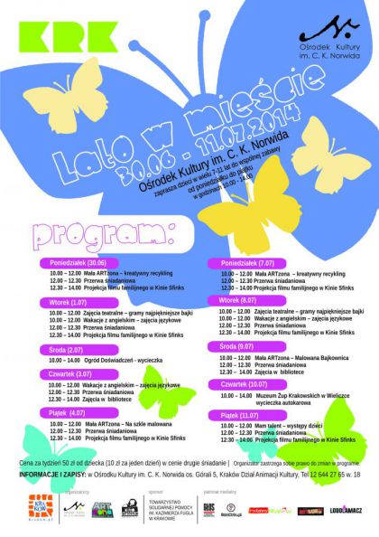 Przed nami lipiec – ulubiony i wyczekany przez dzieci miesiąc. To czas długich ciepłych dni, zabawy, beztroski i odpoczynku. Wiele z Was wyjedzie ale tym, którzy zostaną w lipcu w Nowej Hucie też nie damy się nudzić. Ośrodek Kultury im. C. K. Norwida (os. Górali 5) zaprasza dzieci w wieku 7-11 lat na Lato w Mieście. Przez dwa tygodnie, od poniedziałku do piątku, od 10.00 do 14.00 będziemy Was bawić i rozwijać Waszą kreatywność na wiele sposobów. Będą artrecyklingowe warsztaty w Małej ARTzonie, teatralne przygody ze sceną, wakacyjny angielski na wesoło, książkowe tajemnice w bibliotece, na szkle malowanie i malowana bajkownica, wakacyjne seanse w Kinie Sfinks, doświadczanie w Ogrodzie Doświadczeń i wyprawa autokarowa do Muzeum Żup Krakowskich w Wieliczce. Codziennie będzie czekała na Was wesoła ekipa animatorów, grupa rówieśników a jak zgłodniejecie w trakcie zabawy – świeżutkie drożdżówki i napoje. Serdecznie zapraszamy, koszt 10 zł od dziecka za dzień, szczegółowe informacje i zapisy: os. Górali 5, tel. 12 644 27 65, szczegółowy program na stronie www.okn.edu.pl