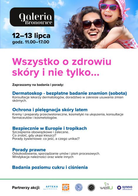 W trakcie weekendu „Wszystko o zdrowiu skóry i nie tylko…” będzie można skorzystać z bezpłatnych porad i badań oferowanych na kilkunastu specjalistycznych stanowiskach. Wszystko po to, aby tegoroczne letnie słońce kojarzyło się nam tylko z aktywnym wypoczynkiem, zdrową skórą i ogólnym zadowoleniem z udanych wakacji.