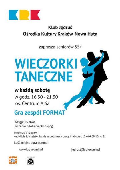 Zabawy taneczne dla seniorów przy muzyce na żywo w Klubie Jędruś Ośrodka Kultury Kraków-Nowa Huta. Do tańca przygrywać będzie zespół Format. Informacje (tel. 12 644 68 10 wew. 21).