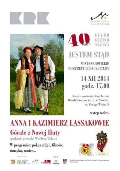 Anna i Kazimierz Lassakowie, goście grudniowego spotkania z cyklu: Jestem stąd… Mistrzejowickie portrety ludzi kultury, są założycielami znanych góralskich zespołów: Hamernik i Mały Hamernik. To niezwykła para ludzi z pasją, dla których autentyczny góralski folklor to sens życia, radość z przekazywania kolejnym pokoleniom tego, co najcenniejsze w naszej narodowej kulturze. W roku 2014 obchodzą jubileusz 50-lecia pracy artystycznej. W uznaniu ich osiągnięć wielokrotnie honorowani nagrodami i medalami m.in. Zasłużony dla Kultury Polskiej, Złoty Krzyż Zasługi, Honoris Gratia, Honorowy Członek Związku Podhalan, tytuł Nowohucian Roku 2009.