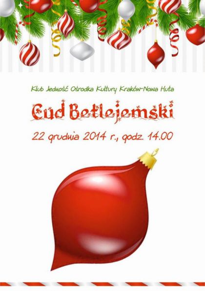 W związku z nadchodzącymi świętami Bożego Narodzenia Klub Jedność Ośrodka Kultury Kraków-Nowa Huta (ul. Drożyska 3c) zaprasza dzieci i rodziców na spotkanie świąteczne Cud Betlejemski.
