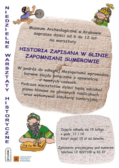Podczas warsztatów dzieci będą odciskać pismo klinowe na glinianych tabliczkach oraz wykonywać biżuterię sumeryjską z modeliny, makaronu i ozdobnego kartonu.
