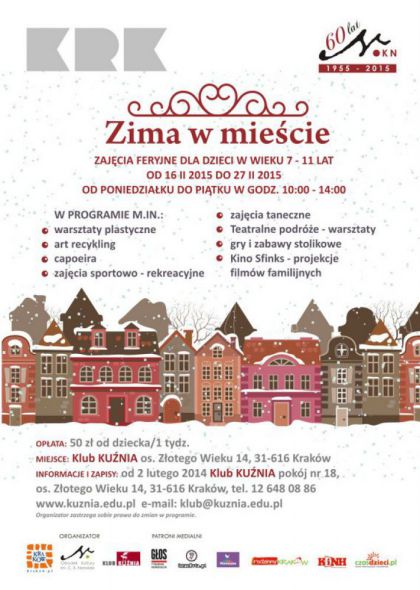 Serdecznie zapraszamy na zajęcia feryjne dla dzieci w wieku 7 - 11 lat w Klubie „Kuźnia” Ośrodka Kultury im. C.K. Norwida na os. Złotego Wieku 14. Zajęcia trwają od 16 do 27 lutego 2015 od poniedziałku do piątku w godzinach 10:00 – 14:00.