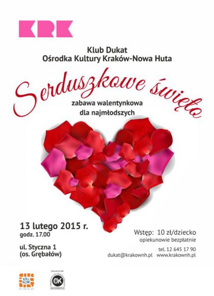 Zabawa dla dzieci od 2 do 10 roku życia wraz z rodzicami lub opiekunami, prowadzona przez animatorów w Klubie Dukat Ośrodka Kultury Kraków-Nowa Huta. Z okazji walentynkowego święta, wspólnie przygotujemy wspaniałe upominki dla tych, których kochamy i będziemy się bawić w rytm gorących małych serduszek. Na uczestników zabawy czekać będzie również słodki poczęstunek.