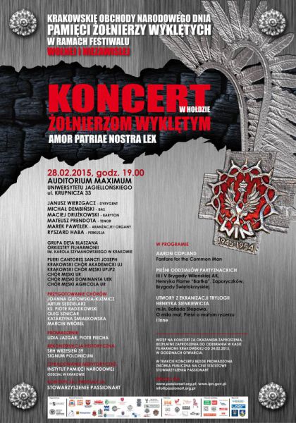 Oddział Instytutu Pamięci Narodowej w Krakowie oraz Stowarzyszenie PASSIONART zapraszają na koncert galowy w Hołdzie Żołnierzom Wyklętym w dniu 28 lutego br.