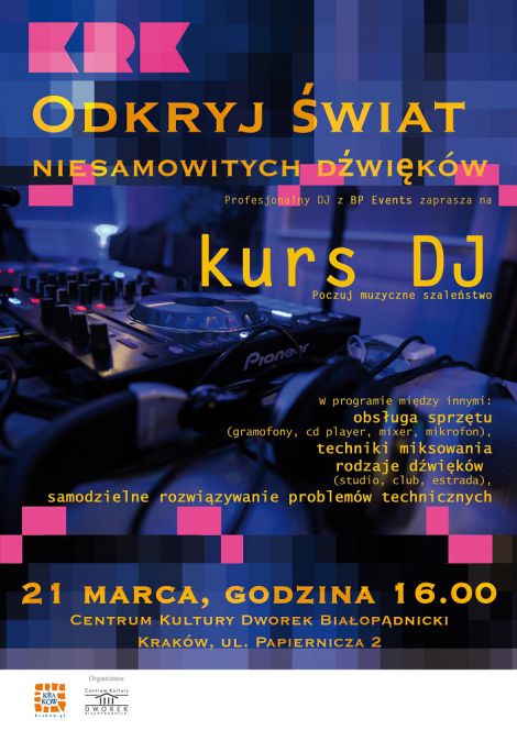 Centrum Kultury „Dworek Białoprądnicki” zaprasza na kurs didżejski, którego uczestnicy kursu będą mieli okazję poznać tajniki pracy didżeja i zagłębić się w świat jego muzyczno-technologicznych fascynacji. To doskonały sposób na twórcze spędzenie czasu i rozwijanie lub obudzenie w sobie pasji didżejskiej.
