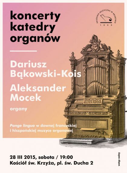 Katedra Organów Akademii Muzycznej w Krakowie zaprasza na koncert, który odbędzie się w kościele św. Krzyża (Pl. św. Ducha 2) w sobotę 28 marca o godzinie 19:00. "Pange lingua w dawnej francuskiej i hiszpańskiej muzyce organowej" wykonają: Dariusz Bąkowski-Kois oraz Aleksander Mocek.