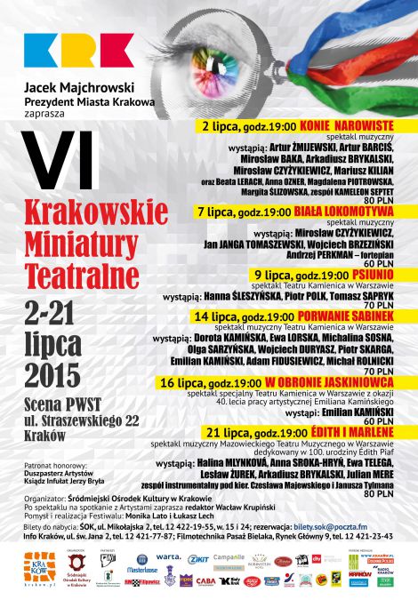 Szóste Krakowskie Miniatury Teatralne zapraszają na sześć wieczorów, z których już pierwszy przeczy nazwie samego przeglądu – no bo co to za miniatury, skoro w inauguracyjnym spektaklu „Konie narowiste” bierze udział dziesięciu aktorów i septet muzyczny? A przywoła ów spektakl, autorstwa Jerzego Satanowskiego, legendarnego Włodzimierza Wysockiego, jedną z ikon kultury XX wieku. Jerzy Satanowski powróci też do Krakowa ze spektaklem „Biała lokomotywa”, który poświęcił swemu tragicznie zmarłemu w wieku 42 lat przyjacielowi, poecie Edwardowi Stachurze. Zwieńczy z kolei Miniatury wyreżyserowana przez Mártę Mészáros inna muzyczna opowieść – o dwóch jakże słynnych kobietach czyli Marlenie Dietrich i Édith Piaf (w tym roku przypada setna rocznica jej urodzin). Na scenie – szóstka aktorów plus zespół muzyczny. Muzyki nie zabraknie i w komedii, której adaptacji dokonał sam Julian Tuwim, czyli w „Porwaniu Sabinek”, również nie miniaturowej bo z udziałem dziewięciu aktorów. Zaprezentuje go, nie pierwszy raz uczestnicząc w tym lipcowym święcie, Teatr Kamienica. Ta prywatna scena, stworzona przez Emiliana Kamińskiego, firmuje też urokliwą, trzyosobową komedię „Psiunio”, z brawurową rolą Hanny Śleszyńskiej, jak i monodram założyciela tego teatru – „W obronie jaskiniowca”. Opowiadający o zawiłościach w damsko-męskich relacjach tekst Roba Beckera, grany w 30 krajach świata, daje Emilianowi Kamińskiemu maksymalne możliwości ujawnienia swej vis comica. Zatem i wieloobsadowa opowieść o Wysockim, i teatr jednego aktora złożą się na ten szósty przegląd teatralny. A że nie miniaturowy on, że – rzec by się chciało – „maksiturowy” zgoła – nic to. Wszak teatr to sztuka umowna i znacznie ważniejsze, by był sztuką właśnie. To rodząca śmiech, to skłaniającą do zamyślenia, to kojącą pięknymi piosenkami, jak „Padam, padam” czy „Milord”, które rozsławiła Piaf. I takie spektakle Państwu rekomendujemy.