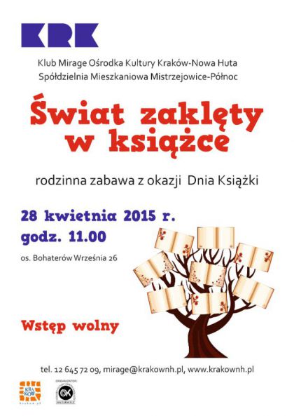 Z okazji Dnia Książki Klub Mirage Ośrodka Kultury Kraków-Nowa Huta (os. Bohaterów Września 26) zaprasza dzieci od 2 do 5 roku życia wraz z rodzicami i dziadkami na szczególne spotkanie z książką. Na wszystkich, którzy w dniu 28 kwietnia przybędą na godz. 11.00 do Klubu czekać będą liczne atrakcje: bajkowe zagadki i quizy, historyjki obrazkowe, wykonywanie zakładek do książek oraz tańce przy muzyce ze znanych i lubianych bajeczek. Przypomnimy sobie najsłynniejsze historie o Czerwonym Kapturku, Królewnie Śnieżce i Krasnoludkach, Jasiu i Małgosi, Calineczce oraz Pinokio. W tym dniu chcemy zachęcać dzieci do oglądania bajek i czytania książek, by mogły przeżywać cudowne chwile ze swoimi ulubionymi bohaterami w magicznym świecie bajek i fantazji. Osoby zainteresowane udziałem prosimy o zgłoszenie udziału przed imprezą.