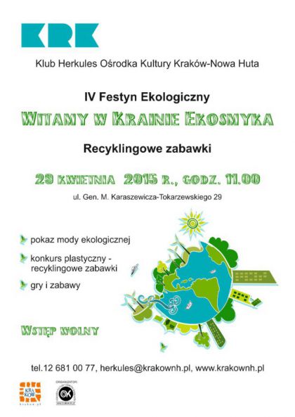 W środę 29 kwietnia zapraszamy na godz. 11.00 do Klubu Herkules Ośrodka Kultury Kraków-Nowa Huta (ul. gen. M. Karaszewicza-Tokarzewskiego 29), gdzie udamy się na wyprawę do Krainy Ekosmyka. Motywem przewodnim tegorocznej edycji Festynu Ekologicznego będą Recyklingowe zabawki. W programie wydarzenia między innymi: konkurs mody ekologicznej, konkurs plastyczny na wykonanie recyklingowych zabawek, mnóstwo zabawy i konkursów o tematyce ekologicznej.