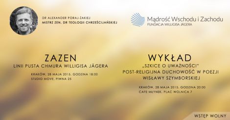 28 maja w Krakowie odbędą się dwa spotkania z Alexandrem Poraj-Żakiejem, mistrzem Zen, uczniem i jednym z następców Willigisa Jaegera. Obecnie pracuje on w Ośrodku Benediktushof w Niemczech, gdzie wraz z Willigisem uczy praktyki Zen linii Pusta Chmura.