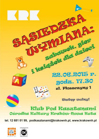 W każdym prawie domu zalegają zabawki, z których pociechy dawno już wyrosły i tylko niepotrzebnie zalegają w kącie, albo dawno już przeczytane książki, które kurza się na półkach. Jeżeli masz takie skarby, to koniecznie zabierz je na kolejną sąsiedzką wymianę w Klubie Pod Kasztanami Ośrodka Kultury Kraków-Nowa Huta (ul. Płoszczyny 1). Może akurat uda ci się znaleźć coś, czego właśnie potrzebujesz i zamiast kupować, wymienisz się fantami z innymi uczestnikami. Na tym polega idea imprezy, coś dajesz i coś zyskujesz i nie musisz za to płacić. Super sprawa! Zapraszamy do Klubu 22 czerwca o godz. 17.30.