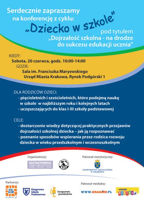 | Pierwszy w Krakowie cykl konferencji skierowany do rodziców, poruszający ważne tematy dotyczące dziecka w szkole. Inicjatywa jest zaproszeniem do dialogu. |