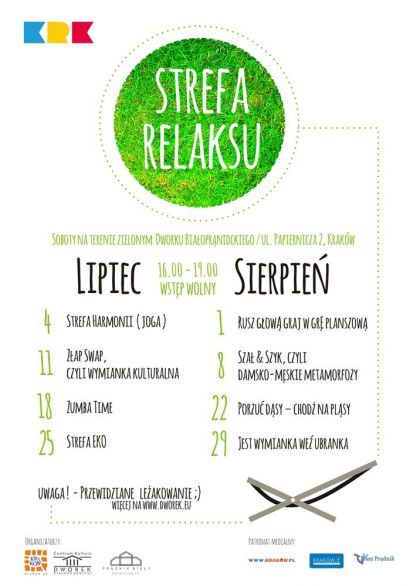Strefa Relaksu w Dworku Białoprądnickim działa w każdą letnią sobotę od godz. 16.00. Odpoczynek, ruch, spotkania z interesującymi ludźmi - plener Dworku jest do tego idealny! Na wszystkich, którzy postanowią skorzystać ze Strefy Relaksu, będą czekały leżaki, koce, książki i gry planszowe. Odbywać się również będą otwarte warsztaty z instruktorami. Zaplanowano pogaduchy o zdrowym żywieniu i sekretach urody, zajęcia florystyczne i taneczne, a także zumbę.