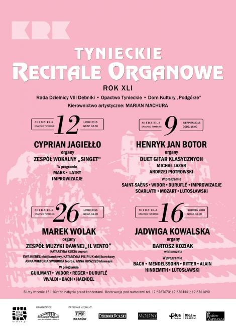 Pierwszy koncert w ramach XLI Tynieckich Recitali Organowych Wykonawcy: CYPRIAN JAGIEŁŁO – organy ZESPÓŁ WOKALNY „SINGET” W programie: OLIVIER LATRY (1962), Salve Regina (cykl 7-częściowy), ALOIS MARX, Missa in honorem S. Henrici imperatoris CYPRIAN JAGIEŁŁO - Improwizacje na temat posoborowej Mszy autorstwa Mariana Machury.