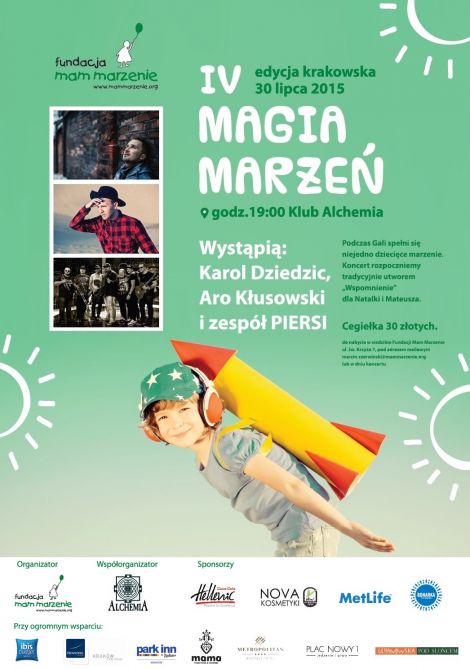 Już po raz czwarty - Ambasador Fundacji Mam Marzenie Małgorzata Kożuchowska oraz wolontariusze serdecznie zapraszają wszystkich na koncert charytatywny „Magia Marzeń IV – edycja krakowska”, który odbędzie się 30 lipca 2015 roku o godzinie 19:00 w klubie Alchemia.