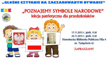 Biblioteka zaprasza dzieci w wieku przedszkolnym na lekcję patriotyczną „Poznajemy symbole narodowe” w cyklu: Głośne czytanie na zaczarowanym dywanie. Podczas zajęć przedszkolaki poznają symbole narodowe: flagę, godło, hymn oraz ich historię. Zajęcia zostaną przeprowadzone w oparciu o książkę „Poradnik małego patrioty” Marcina Przewoźniaka. Jak sam tytuł sugeruje, jej głównym tematem jest patriotyzm. Dla dziecka rozpoczynającego edukację zarówno słowo jak i zagadnienie "patriotyzm" jest nieznane i może wydawać się czymś niezwykle trudnym i należącym do świata dorosłych. Marcin Przewoźniak wprowadza młodego czytelnika w to zagadnienie w bardzo przystępny sposób.